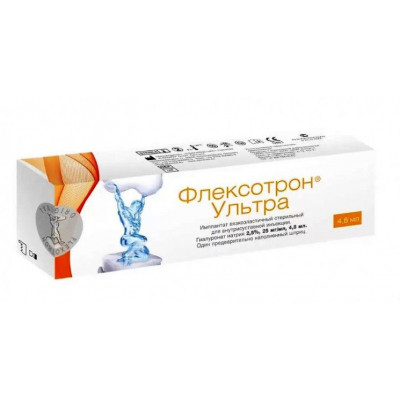 ФЛЕКСОТРОН® Ультра – протез синовиальной жидкости, стерильный, прозрачный вязкоэластичный гель, содержащий гиалуронат натрия, получаемый методом бактериальной ферментации, в фосфатном буфере. Имплантат не содержит лекарственного средства для медицинского применения, материалов животного и (или) человеческого происхождения.