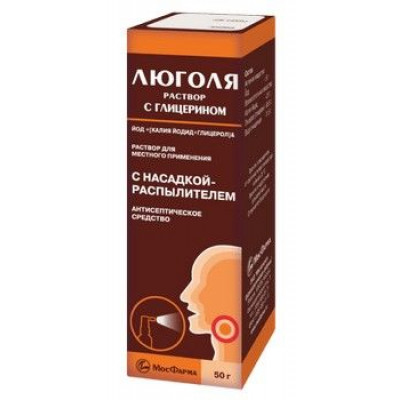 ЛЮГОЛЯ С ГЛИЦЕР. 50Г. Р-Р Д/МЕСТ.ПРИМ. ФЛ. +НАСАДКА РАСПЫЛИТЕЛЬ /МОСКОВСКАЯ ФФ/